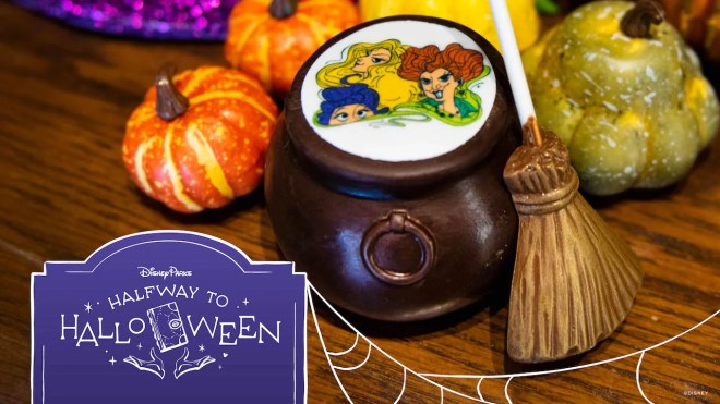 - Sister’s Elixir Hot Cocoa Bomb: Dark chocolate cauldron filled with hot cocoa mix and marshmallows topped with an edible image of the Sanderson Sisters and a chocolate broom stirrer