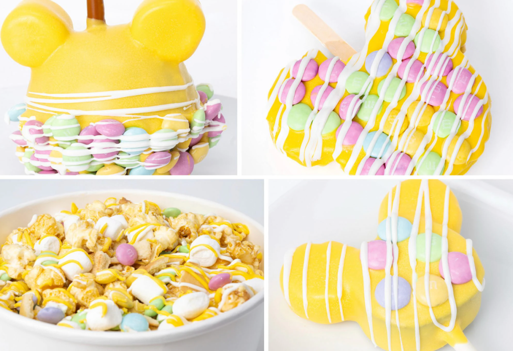 - Mickey Spring Caramel Apple: Granny Smith apple covered in caramel, dipped in yellow-colored chocolate coating with Springtime M&M’s Milk Chocolate candies, and drizzled with white chocolate (New)