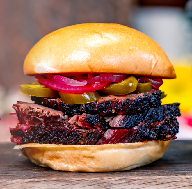 - Smoked Beef Brisket Sandwich with tangy BBQ sauce, pickled red onions, and pickled jalapeños served with beer-battered fries (New)
