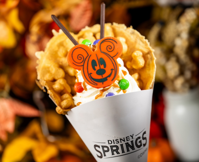 - Mickey Pumpkin Waffle Sundae: Vanilla soft-serve topped with pumpkin-caramel and M&M’S Milk Chocolate Candies (New)