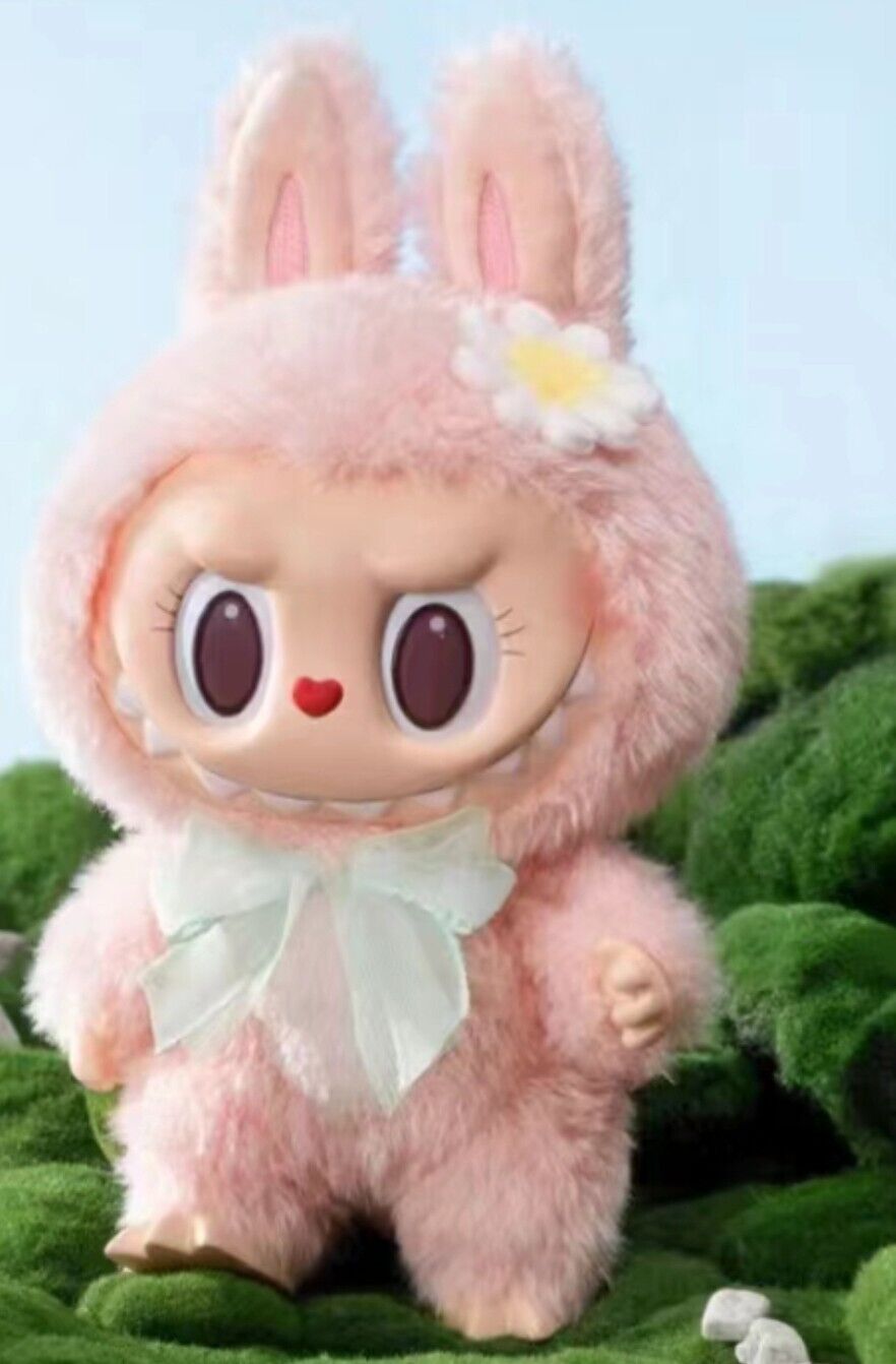 Mokoko’s name means “special,” and her appearance proves she is special. She is characterized by her pastel pink fur and her white belly. She also has curly eyelashes, a cute heart-shaped nose, and a floral scent. Three versions of Mokoko toys have been created for PopLand, a theme park in Beijing, China. Version one, or V1, is The Monsters – Mokoko Close to Sweet Series, in which she wears only a green bow around her neck and a flower on her head. In V2, The Monsters – Mokoko Fall Into Spring Series, she wears a white lace dress and a frilly hat. The latest V3, The Monsters – Mokoko The Blue Diamond Series, pairs a straw sun hat with a baby blue Peter Pan-collar dress with lace details.