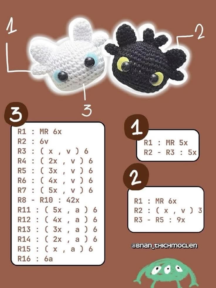 Sew the whisker things (1) to the sides of the head a row right above where the eyes go, ears go right above that almost touching. As for the little hairs for Toothless, set them at the top of the head super close to each other on the top middle of his head.